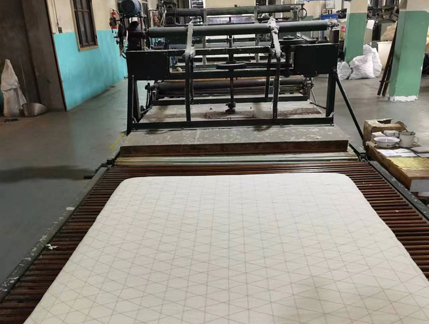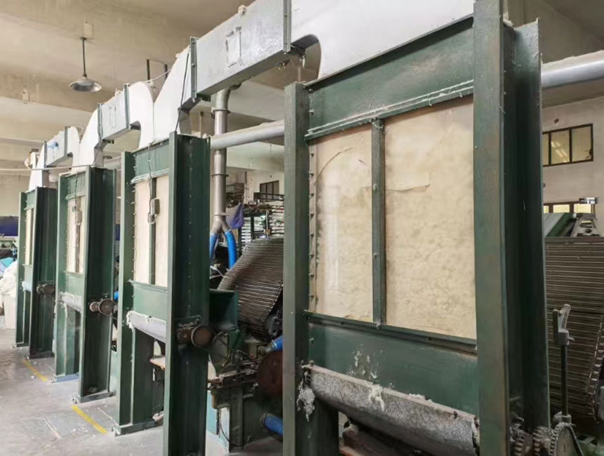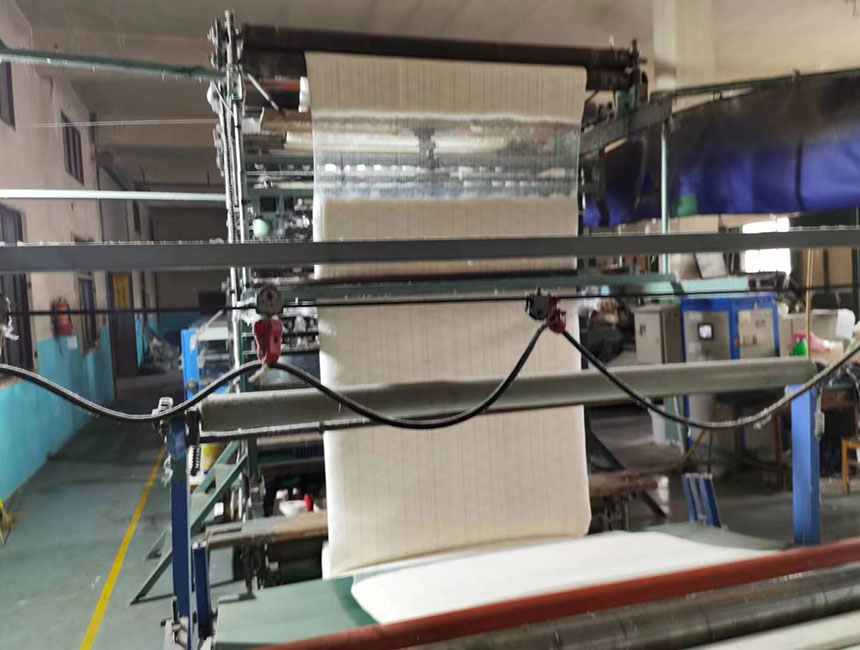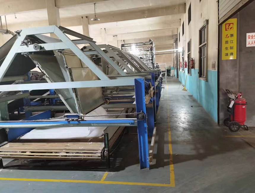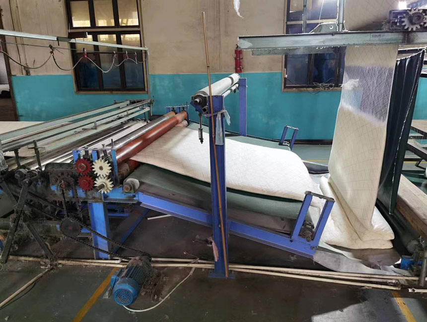 我公司棉胎制造设备绕纱机、棉层稳定气压棉箱、抓棉机加湿装置、梳棉机清理棉屑、振动给棉机、切割断棉机、防止棉花卷入切割刀转抽、棉被固定装置己获发明专利一项、实用新型专利七项,是省内独一无二。从抓棉、清花、送棉、棉箱、梳棉,棉网、横帘、绕纱、电刀、双面研磨一系列程序有电脑自动控制,日产棉胎800条,整条自动生产线只用2名工人。